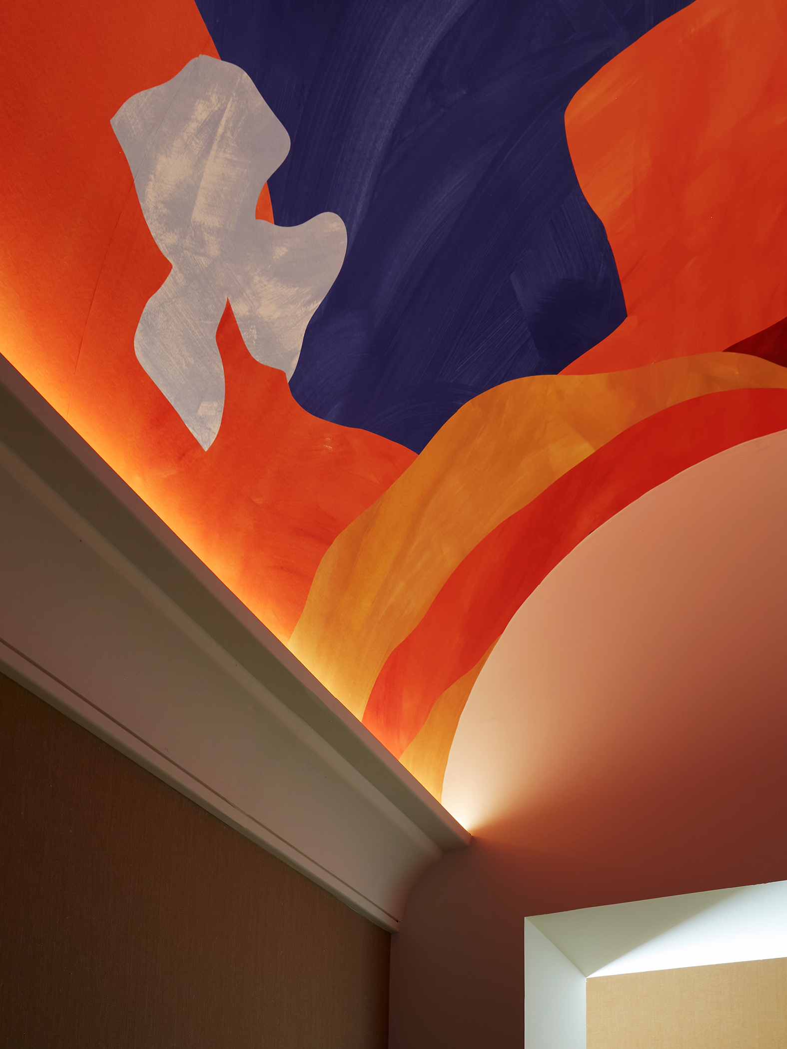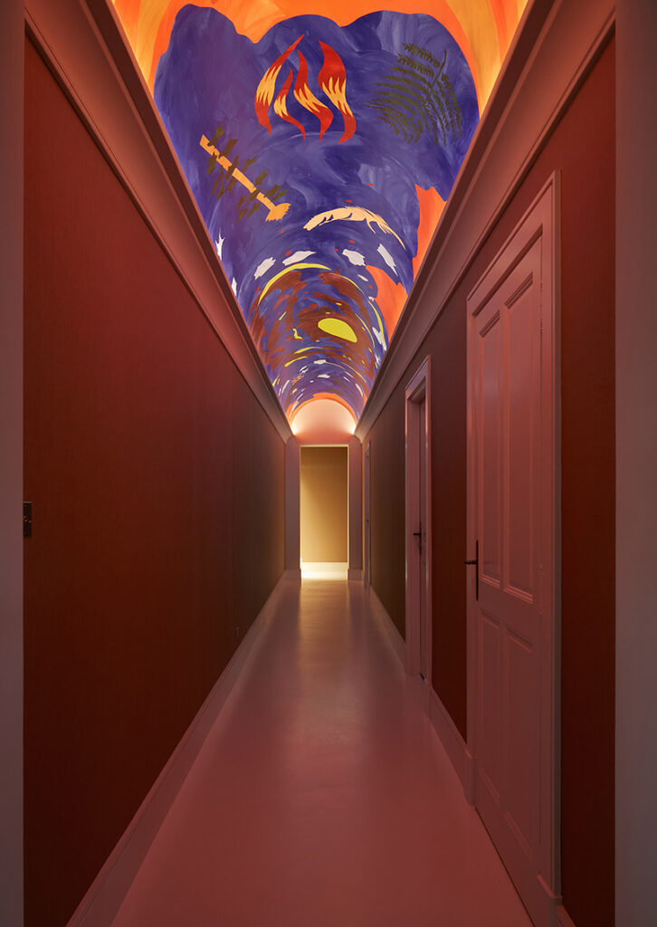 2025 Saint-jean de la blaquière (hérault)Invited by Roque Architecture agency (Delphine Roque and Antonio Buonsante), and the decorator Hugo Rossi, the studio created a mural along a 10-meter corridor. A striking feature of Gérard Bertrand’s villa, the mural retraces the mythology of the landscape in which the villa is situated, amidst the biodynamic vineyards of a small Languedoc village, near Lake Salagou. The panoramic wallpaper was printed in France and then applied to the corridor’s vaulted ceiling to give this passageway a unique character. Several symbols depict a journey from the microscopic world to the macroscopic one so central to biodynamic agriculture.