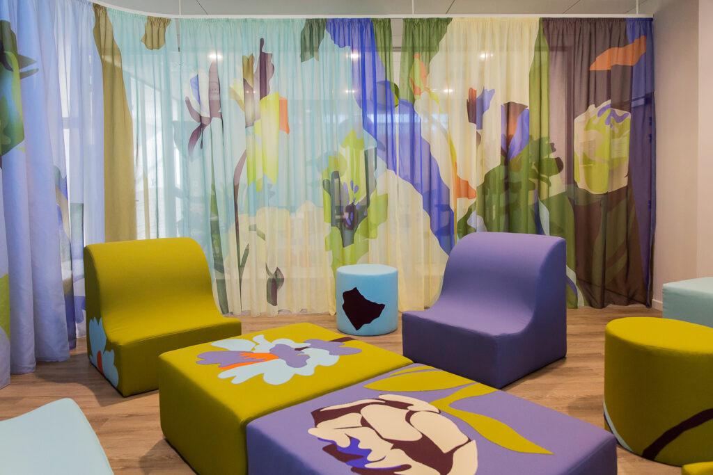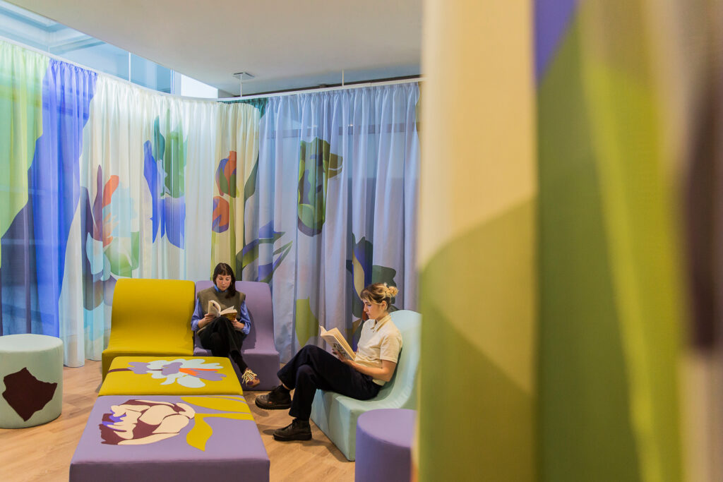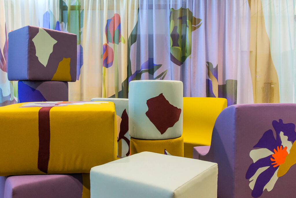 2024 MontpellierDans le cadre d’une résidence en entreprise, l’association Mécènes du Sud invite les Crafties à intervenir au sein du nouveau bâtiment du siège de la Banque Populaire du Sud à Montpellier. Durant une année, le studio a travaillé avec un groupe de volontaires afin de développer leur futur espace de détente. Le fruit de cette rencontre se matérialise dans un “jardin intérieur”, un espace en textile modulable illustré.© Élise Ortiou-Campion